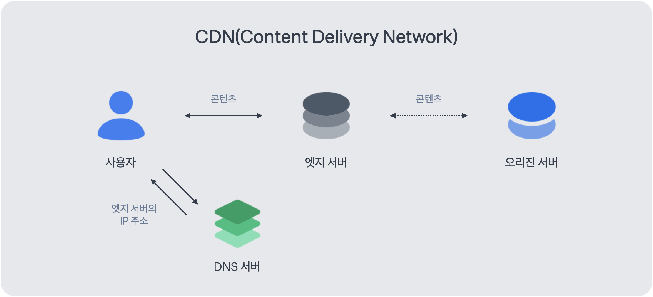 - CDN: 사용자의 물리적 위치와 가까운 서버에서 데이터를 제공함으로써 지연(latency)을 최소화하고 속도를 최적화, 전 세계 여러 위치(엣지 서버)에 콘텐츠 저장