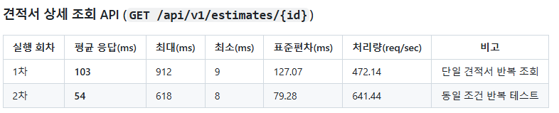 - 견적서 상세 조회 반복 요청 시에도 성능이 개선되는 현상이 나타남 ( Cold Start → Warm State)