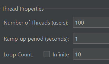 - Thread Group: 사용자 수 100명, Ramp-up 시간 1초, Loop Count 10, 각 테스트당 1000회