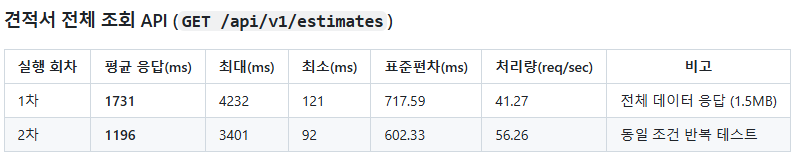 📌 테스트 개요 항목 내용 목적 견적서 API 성능 측정 및 개선 사항 파악 대상 API GET /api/v1/estimates (전체 조회)GET /api/v1/estimates/{id} (상세 조회) 데이터 조건 약 10,000건의 견적서 요청 수 각 테스트